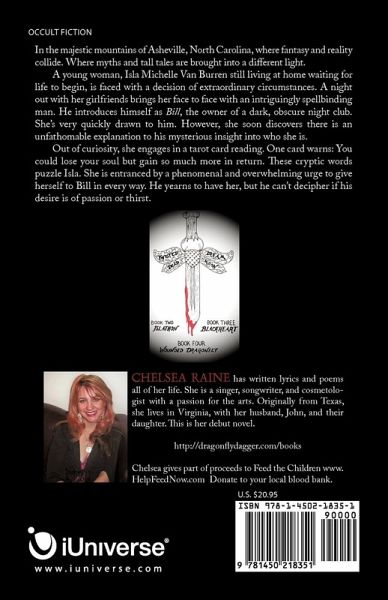 In the majestic mountains of Asheville, North Carolina, where fantasy and reality collide. Where myths and tall tales are brought into a different light. A young woman, Isla Michelle Van Burren still living at home waiting for life to begin, is faced with a decision of extraordinary circumstances. A night out with her girlfriends brings her face to face with an intriguingly spellbinding man. He introduces himself as Bill, the owner of a dark, obscure night club. She's very quickly drawn to him. However, she soon discovers there is an unfathomable explanation to his mysterious insight into who she is. Out of curiosity, she engages in a tarot card reading. One card warns: You could lose your soul but gain so much more in return. These cryptic words puzzle Isla. She is entranced by a phenomenal and overwhelming urge to give herself to Bill in every way. He yearns to have her, but he can't decipher if his desire is of passion or thirst.