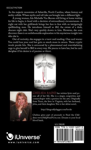 In the majestic mountains of Asheville, North Carolina, where fantasy and reality collide. Where myths and tall tales are brought into a different light. A young woman, Isla Michelle Van Burren still living at home waiting for life to begin, is faced with a decision of extraordinary circumstances. A night out with her girlfriends brings her face to face with an intriguingly spellbinding man. He introduces himself as Bill, the owner of a dark, obscure night club. She's very quickly drawn to him. However, she soon discovers there is an unfathomable explanation to his mysterious insight into who she is. Out of curiosity, she engages in a tarot card reading. One card warns: You could lose your soul but gain so much more in return. These cryptic words puzzle Isla. She is entranced by a phenomenal and overwhelming urge to give herself to Bill in every way. He yearns to have her, but he can't decipher if his desire is of passion or thirst.