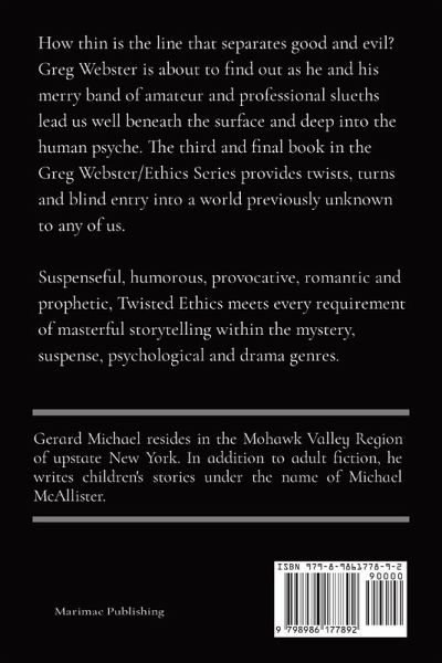 How thin is the line that separates right from wrong or good and evil? Greg Webster is about to find out as he and his eclectic band of amateur and professional sleuths lead us well beneath the surface and deep into the human psyche. The third and final book of the Greg Webster/Ethics Series provides twists, turns and blind entry into a world previously unknown to any of us. Suspenseful, humorous, provocative, romantic and prophetic, Twisted Ethics meets every requirement of masterful storytelling within the mystery, suspense, psychological and drama genres.