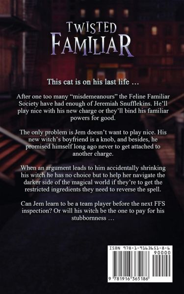 This cat is on his last life ... After one too many "misdemeanours" the Feline Familiar Society have had enough of Jeremiah Snufflekins. He'll play nice with his new charge or they'll bind his familiar powers for good. The only problem is Jem doesn't want to play nice. His new witch's boyfriend is a knob, and besides, he promised himself long ago never to get attached to another charge. When an argument leads to him accidentally shrinking his witch he has no choice but to help her navigate the darker side of the magical world if they're to get the restricted ingredients they need to reverse the spell. Can Jem learn to be a team player before the next FFS inspection? Or will his witch be the one to pay for his stubbornness ... If you like your urban fantasy with snarky feline familiars, you'll love Twisted Familiar, a novel in the Pussy Chronicles world.