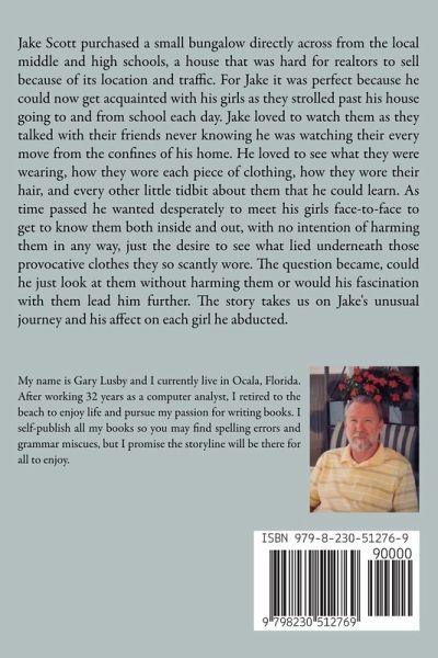 Jake Scott purchased a small bungalow directly across from the local middle and high schools, a house that was hard for realtors to sell because of its location and traffic. For Jake it was perfect because he could now get acquainted with his girls as they strolled past his house going to and from school each day. Jake loved to watch them as they talked with their friends never knowing he was watching their every move from the confines of his home. He loved to see what they were wearing, how they wore each piece of clothing, how they wore their hair, and every other little tidbit about them that he could learn. As time passed he wanted desperately to meet his girls face-to-face to get to know them both inside and out, with no intention of harming them in any way, just the desire to see what lied underneath those provocative clothes they so scantly wore. The question became, could he just look at them without harming them or would his fascination with them lead him further. The story takes us on Jake's unusual journey and his affect on each girl he abducted.