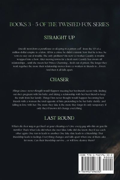 Books 3-5 of the Twisted Fox Series Straight Up Lincoln went from a penthouse to sleeping in a prison cell-from the VP of a million-dollar empire to a felon. All for a crime he didn't commit. Now that he is free, he vows to stay out of trouble. The only problem? His new co-worker, Cassidy, is trouble wrapped into a bow. After moving towns for a fresh start, Cassidy has sworn off relationships ... until she meets her Prince Charming ... fresh out of prison. The longer they work together, the more their relationship moves from co-workers to friends to ... lovers. And then it all falls apart. Chaser Things Grace never thought would happen: meeting her boyfriend's secret wife, finding out she's pregnant with his baby, and faking a relationship with her best friend to keep the truth from her family. Things Finn never thought would happen: becoming best friends with a woman the total opposite of him, pretending to be her baby daddy, and falling in love with her. The more they fake it, the more they forget it's only temporary. If only they'd known it'd change everything. Last Round What's the best way to get back at your cheating ex? Give every guy who hits on you his number. That's what Lola did when she met Silas. Little did she know, they'd see each other again. One run-in leads to another. One fake date leads to a friendship. That friendship leads to feelings. Everything changes and falls apart when one of them asks for more. Can their friendship survive ... or will love destroy them?
