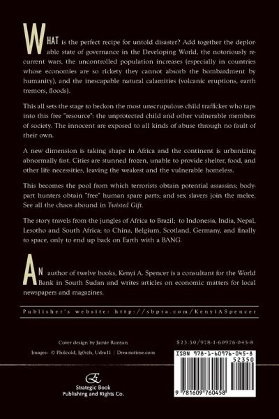 What is the perfect recipe for untold disaster? Add together the deplorable state of governance in the Developing World, the notoriously recurrent wars, the uncontrolled population increases (especially in countries whose economies are so rickety they cannot absorb the bombardment by humanity), and the inescapable natural calamities (volcanic eruptions, earth tremors, floods). This all sets the stage to beckon the most unscrupulous child trafficker who taps into this free "resource": the unprotected child and other vulnerable members of society. The innocent are exposed to all kinds of abuse through no fault of their own. A new dimension is taking shape in Africa and the continent is urbanizing abnormally fast. Cities are stunned frozen, unable to provide shelter, food, and other life necessities, leaving the weakest and the vulnerable homeless. This becomes the pool from which terrorists obtain potential assassins; body-part hunters obtain "free" human spare parts; and sex slavers join the melee. See all the chaos abound in Twisted Gift. The story travels from the jungles of Africa to Brazil; to Indonesia, India, Nepal, Lesotho and South Africa; to China, Belgium, Scotland, Germany, and finally to space, only to end up back on Earth with a BANG. An author of twelve books, Kenyi A. Spencer is a consultant for the World Bank in South Sudan and writes articles on economic matters for local newspapers and magazines. Publisher's website: http://sbpra.com/KenyiASpencer