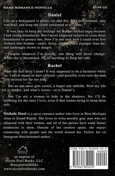 Daniel Life as a bodyguard is pretty cut and dry. Stay professional, stay watchful, and keep the client unharmed at all costs. It was easy to keep my feelings for Rachel locked away because I had strong boundaries. But I never expected to have to cross those boundaries to protect her. Now I'm not sure how I could ever live without this woman-smart, fierce, fifteen years younger than me, and seemingly drawn to danger. Despite whatever I'm feeling, one thing will never change: When she is threatened, I'll do anything to keep her safe. Rachel What the hell have I done? It was supposed to be a harmless white lie. I never meant to hurt a friend-and possibly even ruin the man I've desired for far too long. But as one mess gets sorted, a larger one unfolds. Now my life is in danger, and what's worse-so is Daniel's. But I'm not a woman to hide in the shadows. No, I'll do anything for the ones I love, even if that means dying to keep them safe.