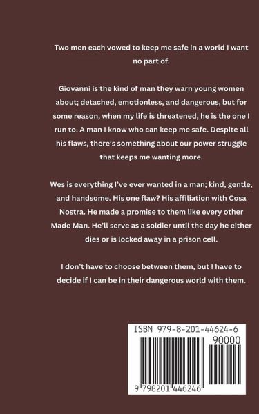 Two men each vowed to keep me safe in a world I want no part of. Giovanni is the kind of man they warn young women about; detached, emotionless, and dangerous, but for some reason, when my life is threatened, he is the one I run to. A man I know who can keep me safe. Despite all his flaws, there's something about our power struggle that keeps me wanting more. Wes is everything I've ever wanted in a man; kind, gentle, and handsome. His one flaw? His affiliation with Cosa Nostra. He made a promise to them like every other Made Man. He'll serve as a soldier until the day he either dies or is locked away in a prison cell. I don't have to choose between them, but I have to decide if I can be in their dangerous world with them.