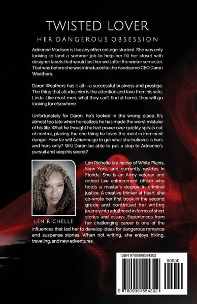 When Love Entwines with Dangerous Allure! 'Twisted Lover: Her Dangerous Obsession' is a spellbinding romance thriller that weaves a web of desire, obsession, and dangerous secrets. Adrienne Madison, a typical college student, starts a journey to fulfill her singular goal-landing a summer job to indulge in the luxury of high-end designer labels. Little does she know that pursuing luxury will entangle her in a web of passion with Daron Weathers, a successful CEO seeking fulfillment outside his seemingly perfect life. In the sanctuary of his yearnings, the warmth and love from Linda, his wife, persist as elusive whispers in the corridors of his deepest desires. Craving what evades within the sanctuary of the home, he ventures forth in pursuit of solace elsewhere. Regrettably, for Daron, his search has led him astray. The realization of his gravest mistake hits him just as time slips away. The control he believed he held tightly begins to unravel, endangering the very thing he cherishes most. Adrienne relentlessly pursues what she deems rightfully hers, the question looms: How as determined is she, and can Daron halt her pursuit while safeguarding his well-kept secret? * Twisted Romance: This is a love story where passion and danger collide in unexpected ways. * Intriguing Characters: Meet Adrienne, a college student yearning for luxury, and Daron Weathers, a titan of success and CEO caught in a perilous game of obsession. * Suspenseful Plot: This narrative will make you experience a gripping storyline, and you will keep guessing until the very end as events spiral out of control, endangering everything the characters hold dear. * Mystery and Drama: This is not just romance but a rollercoaster ride of mystery and drama, delving into the hidden motives and desires that drive the characters' actions. * Unpredictable Twists: Twisted Lover will brace you for unexpected plot twists that challenge your assumptions and leave you craving more. ◆Why You Will Love Twisted Lover? 1. Alluring Intrigue: This is an enticing journey into a world where love intertwines with irresistible allure, drawing readers into a realm teeming with secrets and clandestine desires. 2. Emotional Symphony: The reader can resonate with the depths of emotions as characters' lives entwine in unexpected harmony, creating a captivating symphony that will evoke a spectrum of feelings. Grab your copy now and explore the enthralling conclusion where the relentless pursuit of Adrienne unfolds, each page a suspenseful revelation. As the story hurtles towards its climax, the burning question remains: How resolute is Adrienne in her quest, and can Daron navigate the tumultuous waters of her determination while safeguarding the shadows of his well-kept secret? Prepare to witness the threads of desire, danger, and destiny in a climax you won't see coming.