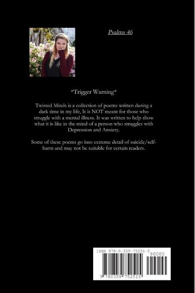 Twisted Minds is a book of poems that I wrote for three years of my life and contemplated publishing for the past five years. It has dark, mature content that deeply describe suicide and self-harm. Twisted Minds is NOT recommended for those who struggle with mental health or who are easily triggered.