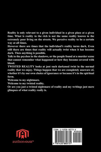 Reality is only relevant to a given individual in a given place at a given time. What is reality to the rich is not the same reality known to the extremely poor living on the streets. We perceive reality to be a certain way at all times. However there are times that the individual's reality turns dark. Even still there are times that reality will actually twist when it has become dark. Then anything is possible. Talk to the psychos in the shadows, or the people found at a murder scene that cannot remember what happened or how they became covered with blood. TWISTED REALITY looks at just such darkened twist in the normal reality that we enjoy. Things happen that we are completely unaware of, whether it's by our own choice of ignorance or because it's in the spiritual form. Welcome to my nightmare. Welcome to my twisted reality. Or are you just a twisted nightmare of reality and my writings just mere glimpses of what reality really is.