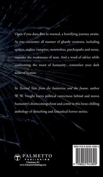 Enter a world of pure terror in this chilling collection of horror stories that spotlights humanity's shortcomings. Devoid of all political correctness, Twisted Tales from the Insensitive and the Insane is an anthology of disturbing horror stories to frighten even the most stalwart of horror enthusiasts. Showcasing a dark sense of humor, author W. W. Vought employs all manner of ghastly creatures, including spiders, snakes, vampires, werewolves, psychopaths and worse, to lay bare the weaknesses of man, thus positioning humanity's shortcomings front and center. A ghastly display of horror, the book will agree with anyone who loves the darkest side of the genre.