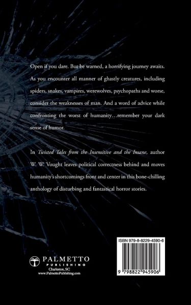 Enter a world of pure terror in this chilling collection of horror stories that spotlights humanity's shortcomings. Devoid of all political correctness, Twisted Tales from the Insensitive and the Insane is an anthology of disturbing horror stories to frighten even the most stalwart of horror enthusiasts. Showcasing a dark sense of humor, author W. W. Vought employs all manner of ghastly creatures, including spiders, snakes, vampires, werewolves, psychopaths and worse, to lay bare the weaknesses of man, thus positioning humanity's shortcomings front and center. A ghastly display of horror, the book will agree with anyone who loves the darkest side of the genre.
