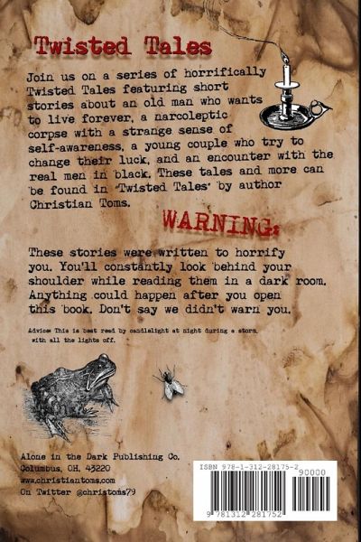 Join us on a series of horrifically Twisted Tales featuring short stories about an old man who wants to live forever, a narcoleptic corpse with a strange sense of self-awareness, a young couple who try to change their luck, and an encounter with the real men in black. These tales and more can be found in "Twisted Tales" by author Christian Toms.