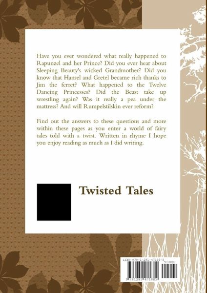 Traditional Fairy tales with a twist. Told in rhyme find out the answers to these puzzling questions. Who became rich thanks to Jim the ferret? What really happened to Rapunzel? Did the Beast ever marry Beauty? Will Rumpelstiltskin ever reform? Why are the Twelve Dancing Princesses in a boarding school? Did Princess Patricia marry her frog prince?