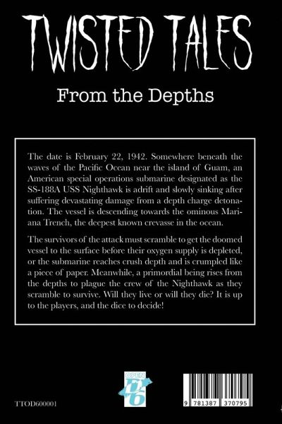 The date is February 22, 1942. Somewhere beneath the waves of the Pacific Ocean near the island of Guam, an American special operations submarine designated as the SS-188A USS Nighthawk is adrift and slowly sinking after suffering devastating damage from a depth charge detonation. The vessel is descending towards the ominous Mariana Trench, the deepest known crevasse in the ocean. The survivors of the attack must scramble to get the doomed vessel to the surface before their oxygen supply is depleted, or the submarine reaches crush depth and is crumpled like a piece of paper. Meanwhile, a primordial being rises from the depths to plague the crew of the Nighthawk as they scramble to survive. Will they live or will they die? It is up to the players, and the dice to decide! Twisted Tales: From the Depths is the first in a series of one shot adventure scenarios for use with the OpenD6 rules system to help you get acquainted with the rules or to introduce new players to this exciting cinematic role playing game. In each scenario you will receive the basic rules for action and combat resolution, and at least six player character templates designed specifically for usage in the scenario. This booklet, along with a handful of six sided dice are all you will need to allow you to play the adventure. If you'd like to include additional rules to enhance game play, you will find directions within the book to help you acquire the original OpenD6 rues sets.