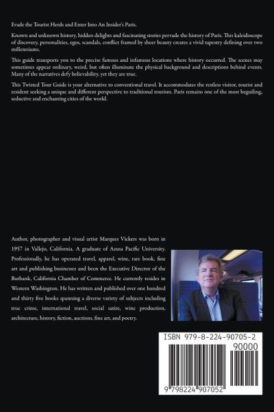 Evade the Tourist Herds and Enter Into An Insider's Paris. Known and unknown history, hidden delights and fascinating stories pervade the history of Paris. This kaleidoscope of discovery, personalities, egos, scandals, conflict framed by sheer beauty creates a vivid tapestry defining over two millenniums. This guide transports you to the precise famous and infamous locations where history occurred. The scenes may sometimes appear ordinary, weird, but often illuminate the physical background and descriptions behind events. Many of the narratives defy believability, yet they are true. This Twisted Tour Guide is your alternative to conventional travel. It accommodates the restless visitor, tourist and resident seeking a unique and different perspective to traditional tourism. Paris remains one of the most beguiling, seductive and enchanting cities of the world. Historical Events Lady Di's Fatal Car Wreck, Dreyfus Affair, Stock Market Crashes, Bastille Destruction, World War II Occupation, Deportations and Liberation, Panama Canal, Mississippi Bubble, Kim Kardashian Robbery, Knight Templar Grandmaster Scandals, Legion of Honor Scandal, Louis Vuitton Collaboration, May 1968 Protest, Ministry of War Bombing, Mona Lisa Theft, Burnings At The Stake, Paris Prostitution, Presidential Assassination Attempt, Sorbonne Riots, The Saint Bartholomew Day Massacre, St. Gervais Bombing, Louisiana Purchase and Witch Burnings. Landmarks: Eiffel Tower, Arc de Triomphe, Place de la Concorde, Tuileries Palace, July Column, Caveau de la Huchette, Notre Dame Cathedral Fire, Rue du Chat Qui Peche, Musee de Cluny, Fountain Saint Michael, Comic Opera House, Arc de Triomphe de Carrousel, Conciergerie, Covered Shopping Arcades, Elysee Palace, Fountain du Palmier, Hotel de Ville, Les Invalides, La Victoire Synagogue, Le Centaure Sculpture, Les Halles, Louvre Colonnade and Pyramid, Maxim's Restaurant, Moulin Rouge, Apollo on Pegasus Sculpture, St. Sulpice Church, Shakespeare and Company, Louis XVI Square, St. Elizabeth de Hongrie, St. Paul's Church, Saint Germain L'Auxerrois Church, Knights Templar Fortress, Tower of Jean The Fearless, Saint Jacques Tower, Paris Sinkholes and Catacombs, Vendome Column and Canal Saint-Martin. Political and Historical Figures Napoleon Bonaparte, Jim Morrison, Joan of Arc, King Louis Phillipe, Benjamin Franklin, Otto von Bismarck, Cardinal Richelieu, Diane de Poitiers. Maurice Papon, Marquis de Sade, Alfred Dreyfus, Jean The Fearless, Duke of Wellington, King Edward VII, Abbe Pierre, Empress Josephine, Desiree Clary, Eugene Poubelle, Detective Eugene Vidocq, Francois Mitterrand, George Boulanger, Dr. Joseph Guillotin, Henry IV, Marquise de Montespan, Louis XIV, Madame de Maintenon, Jacques Necker, Louis XVI, Jean-Baptiste Colbert, General Lafayette, La Paiva, Louis Bonaparte, Louis Napoleon, Madame du Barry, Marshall August Marmont, Marthe Hanau, Pauline Bonaparte, Queen Margot of Navarre, Thomas Jefferson, James Monroe and Foreign Minister Talleyrand. Revolutionaries Maximilien Robespierre, Auguste Blanqui, Camille Desmoulins, Ho Chi Minh, Vladimir Lenin, Leon Trotsky, Karl Marx, Freidrich Engels, Count Mirabeau, Georges Danton and Pierre-Joseph Proudhon, Literary, Visual and Performance Artists and Venues Moliere, Emile Zola, Sarah Bernhardt, Voltaire, Honore de Balzac, Victor Hugo, Centre Pompidou, Musee D'Orsay, Brigitte Bardot, Coco Channel, Colette, Andre Chenier, Edith Piaf, Jacques-Louis David, Jean Jacques Rousseau, Francois Truffaut, Jean-Paul Sartre, Rene Descartes, Auguste Rodin, Simone de Beauvoir, Theatre de l'Athenee, Garnier Opera House, Theatre de l'Oeuvre, Theo van Gough, Thomas Paine, Henri Toulouse-Lautrec and Alain Delon Murders and Massacres: 2015 Terrorist Rampage, Stevan Markovic, Saint Michel Bridge Massacre, Ben Barka Abduction, Brahim Bouarram, Carlos The Jackal, Charlie Hebdo Massacre, Du...