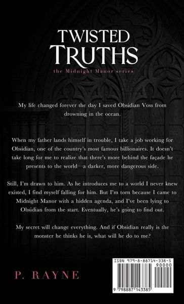 A dark contemporary billionaire romance with a tortured hero, touch her and die, and secret society tropes from USA Today Bestselling Author duo P. Rayne. My life changed forever the day I saved Obsidian Voss from drowning in the ocean. When my father lands himself in trouble, I take a job working for Obsidian, one of the country's most famous billionaires. It doesn't take long for me to realize that there's more behind the façade he presents to the world-a darker, more dangerous side. Still, I'm drawn to him. As he introduces me to a world I never knew existed, I find myself falling for him. But I'm torn because I came to Midnight Manor with a hidden agenda, and I've been lying to Obsidian from the start. Eventually, he's going to find out. My secret will change everything. And if Obsidian really is the monster he thinks he is, what will he do to me?