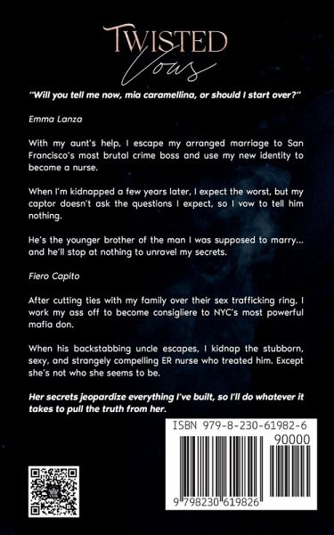 "Will you tell me now, mia caramellina, or should I start over?" Emma Lanza With my aunt's help, I escape my arranged marriage to San Francisco's most brutal crime boss and use my new identity to become a nurse. When I'm kidnapped a few years later, I expect the worst, but my captor doesn't ask the questions I expect, so I vow to tell him nothing. He's the younger brother of the man I was supposed to marry... and he'll stop at nothing to unravel my secrets. Fiero Capito After cutting ties with my family over their sex trafficking ring, I work my ass off to become consigliere to NYC's most powerful mafia don. When his backstabbing uncle escapes, I kidnap the stubborn, sexy, and strangely compelling ER nurse who treated him. Except, she's not who she seems to be. Her secrets jeopardize everything I've built, so I'll do whatever it takes to pull the truth from her. Twisted Vows (Vicious Mafia Kings Book 3) is a super spicy enemies to lovers dark mafia arranged marriage romance with a jealous/possessive hero, a strong, competent female lead, and a deliciously dirty battle of wills. This story is intended for 18+ readers and includes mature content such as graphic violence, profanity, sexual assault, and other adult themes. Can be read as a standalone. HEA guaranteed.