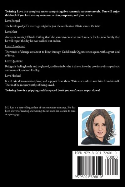 Twisting Love is a complete series comprising five romantic suspense novels. You will enjoy this book if you love steamy romance, action, suspense, and plot twists. Love Forged The breakup of Jeff's marriage might be just the retribution Olivia wants. Or is it? Love Nest Annajane wants Jeff back. Failing that, she wants to cause so much misery for his new family that he will regret the day he ever walked out on her. Love Unsolicited The winds of change are about to blow through Cuddlesack Queens once again, with a great deal of force. Love Quotient Bridget is feeling lonely and neglected, and inevitably she is drawn into the province of sympathetic and sensual Cameron Hadley. Love Hacked It will take determination, love, and support from those Wain cast aside to save him from himself. That is, if he is even worthy of being saved. Twisting Love is a gripping and fast-paced book you won't want to put down!