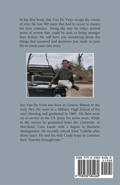 In his first book, Jim Van De Veire recaps the events of over the last 300 years that had to occur to ensure his very existence. Along the way he relays several series of events that could be seen as being stranger than fiction. He will have you wondering about the things that occurred and decisions you made in your life to create your own story. Jim Van De Veire was born in Geneva, Illinois in the early 50's. He went to a Military High School of his own choosing and graduated in 1969. He then went on to service in the US Army for seven years. While in the service he graduated from the University of Maryland, Cum Laude with a degree in Business Management. He recently retired from Toshiba after thirty years. He and his wife Cindy hope to continue their "journey through time."