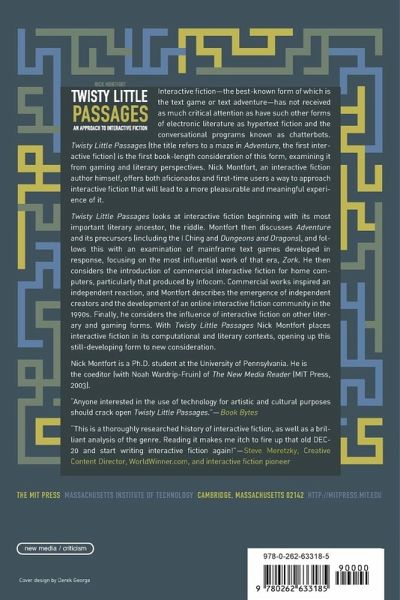 A critical approach to interactive fiction, as literature and game. Interactive fiction—the best-known form of which is the text game or text adventure—has not received as much critical attention as have such other forms of electronic literature as hypertext fiction and the conversational programs known as chatterbots. Twisty Little Passages (the title refers to a maze in Adventure, the first interactive fiction) is the first book-length consideration of this form, examining it from gaming and literary perspectives. Nick Montfort, an interactive fiction author himself, offers both aficionados and first-time users a way to approach interactive fiction that will lead to a more pleasurable and meaningful experience of it. Twisty Little Passages looks at interactive fiction beginning with its most important literary ancestor, the riddle. Montfort then discusses Adventure and its precursors (including the I Ching and Dungeons and Dragons), and follows this with an examination of mainframe text games developed in response, focusing on the most influential work of that era, Zork. He then considers the introduction of commercial interactive fiction for home computers, particularly that produced by Infocom. Commercial works inspired an independent reaction, and Montfort describes the emergence of independent creators and the development of an online interactive fiction community in the 1990s. Finally, he considers the influence of interactive fiction on other literary and gaming forms. With Twisty Little Passages, Nick Montfort places interactive fiction in its computational and literary contexts, opening up this still-developing form to new consideration.