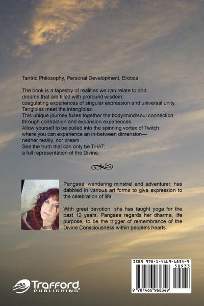 The book is a tapestry of realities we can relate to and dreams that are filled with profound wisdom; coagulating experiences of singular expression and universal unity. Tangibles meet the intangibles. This unique journey fuses together the body/mind/soul connection through contraction and expansion experiences. Allow yourself to be pulled into the spinning vortex of Twitch where you can experience an in-between dimension- neither reality, nor dream. See the truth that can only be THAT; a full representation of the Divine.