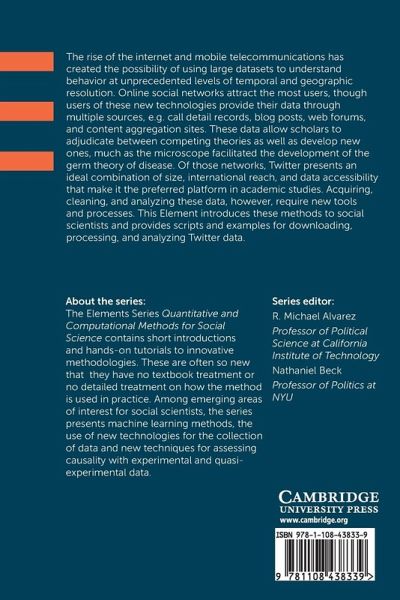 The rise of the internet and mobile telecommunications has created the possibility of using large datasets to understand behavior at unprecedented levels of temporal and geographic resolution. Online social networks attract the most users, though users of these new technologies provide their data through multiple sources, e.g. call detail records, blog posts, web forums, and content aggregation sites. These data allow scholars to adjudicate between competing theories as well as develop new ones, much as the microscope facilitated the development of the germ theory of disease. Of those networks, Twitter presents an ideal combination of size, international reach, and data accessibility that make it the preferred platform in academic studies. Acquiring, cleaning, and analyzing these data, however, require new tools and processes. This Element introduces these methods to social scientists and provides scripts and examples for downloading, processing, and analyzing Twitter data.