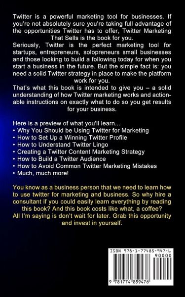 Twitter is a powerful marketing tool for businesses. If you're not absolutely sure you're taking full advantage of the opportunities Twitter has to offer, Twitter Marketing That Sells is the book for you. Seriously, Twitter is the perfect marketing tool for startups, entrepreneurs, solopreneurs small businesses and those looking to build a following today for when you start a business in the future. But the simple fact is: you need a solid Twitter strategy in place to make the platform work for you. That's what this book is intended to give you - a solid understanding of how Twitter marketing works and actionable instructions on exactly what to do so you get results for your business. Here is a preview of what you'll learn...Why You Should be Using Twitter for Marketing How to Set Up a Winning Twitter Profile How to Understand Twitter Lingo Creating a Twitter Content Marketing Strategy How to Build a Twitter Audience How to Avoid Common Twitter Marketing Mistakes Much, much more! You know as a business person that we need to learn how to use twitter for marketing and business. So why hire a consultant if you could easily learn everything by reading this book? And this book costs like what, a coffee? All I'm saying is don't wait for later. Grab this opportunity and invest in yourself.