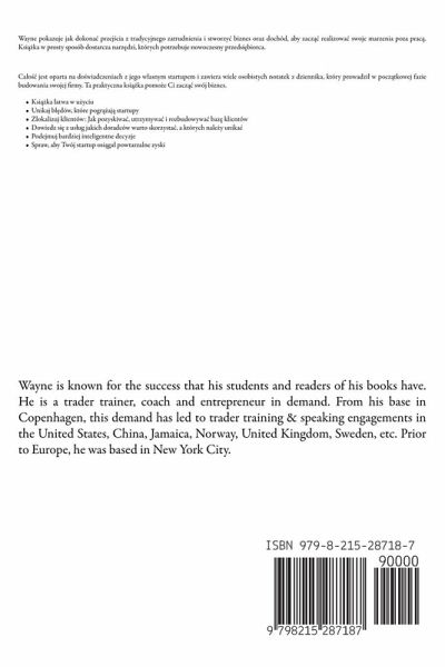 Wayne pokazuje jak dokonä przej¿cia z tradycyjnego zatrudnienia i stworzy¿ biznes oraz dochód, aby zacz¿¿ realizowä swoje marzenia poza prac¿. Ksi¿¿ka w prosty sposób dostarcza narz¿dzi, których potrzebuje nowoczesny przedsi¿biorca. Cäö¿ jest oparta na döwiadczeniach z jego w¿asnym startupem i zawiera wiele osobistych notatek z dziennika, który prowadzi¿ w pocz¿tkowej fazie budowania swojej firmy. Ta praktyczna ksi¿¿ka pomöe Ci zacz¿¿ swój biznes.Ksi¿¿ka ¿atwa w üyciu Unikaj b¿¿dów, które pogr¿¿aj¿ startupy Zlokalizuj klientów: Jak pozyskiwä, utrzymywä i rozbudowywä baz¿ klientów Dowiedz si¿ z…mehr