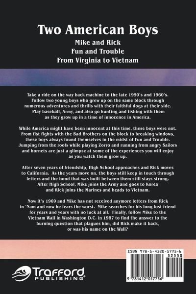 Two American Boys is a story of two childhood best friends, Mike and Rick, who grew up on the same block. Relive the late 50s and 60s with their numerous adventures and thrill with their faithful dogs, Ginger and Blackie, at their side. Play baseball, army and go hunting and fishing with Mike's father and enjoy his many stories, as they grow up in a time of innocence in America.? While America might have been innocent, these boys were not. From fistfights with the Bad Brothers on the block to breaking windows, these boys always found themselves in the midst of fun and trouble. Jumping from roofs while playing Zorro and running from angry sailors and hornets are just a glimpse at some of their experiences you will enjoy as you watch them grow up. After years of friendship, high school approaches and Rick moved to California. As the years went by, the boys still kept in touch through letters and the bond that was built between them still stays strong. After high school, Mike joined the army and went to Korea while Rick joined the Marines and went to Vietnam. It was 1969 and Mike had not received anymore letters from Rick in 'Nam and now he feared the worst. Mike searched for his long lost friend for years and years with no luck at all. Finally, follow Mike to the Vietnam Wall in Washington, D.C. to find the answer to the question that plagued him: Did Rick make it back or was his name on the Wall?
