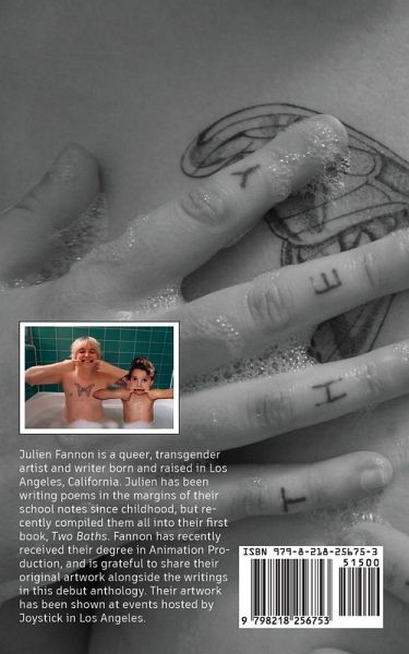 Two Baths is a collection of art and poetry from Los Angeles artist Julien Fannon. Told in two parts, Two Baths is a raw look into the formative years of a person struggling to accept the deepest parts of themself. With poems spanning over a decade, the reader is taken on a journey towards self-love and affirmation all the while navigating an ignorant world and unforgiving teen angst. Get ready to dive in and grow along with Julien in their debut anthology.