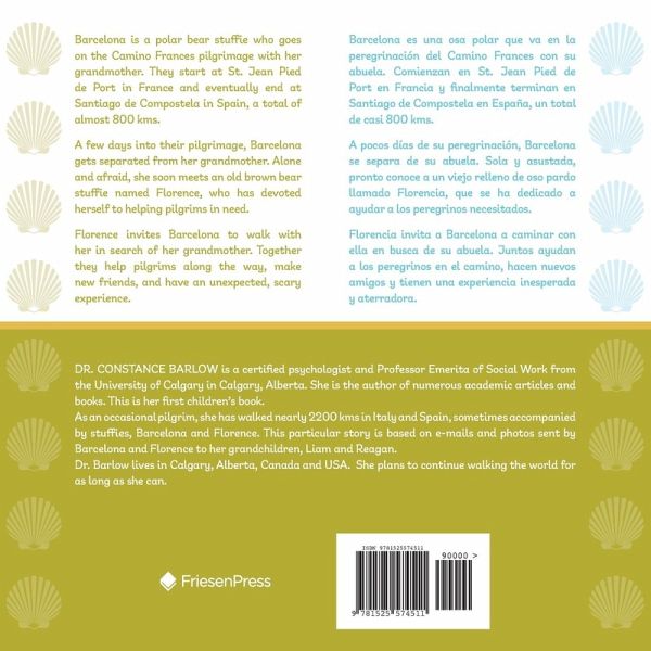 Barcelona is a polar bear stuffie who goes on the Camino Frances pilgrimage with her grandmother. They start at St. Jean Pied de Port in France and eventually end at Santiago de Compostela in Spain, a total of almost 800 kms. A few days into their pilgrimage, Barcelona gets separated from her grandmother. Alone and afraid, she soon meets an old brown bear stuffie named Florence, who has devoted herself to helping pilgrims in need. Florence invites Barcelona to walk with her in search of her grandmother. Together they help pilgrims along the way, make new friends, and have an unexpected, scary experience. Barcelona es una osa polar que va en la peregrinación del Camino Frances con su abuela. Comienzan en St. Jean Pied de Port en Francia y finalmente terminan en Santiago de Compostela en España, un total de casi 800 kms. A pocos días de su peregrinación, Barcelona se separa de su abuela. Sola y asustada, pronto conoce a un viejo relleno de oso pardo llamado Florencia, que se ha dedicado a ayudar a los peregrinos necesitados. Florencia invita a Barcelona a caminar con ella en busca de su abuela. Juntos ayudan a los peregrinos en el camino, hacen nuevos amigos y tienen una experiencia inesperada y aterradora.