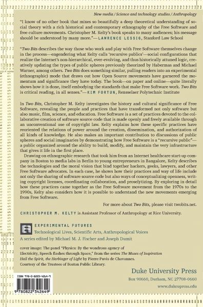 In Two Bits, Christopher M. Kelty investigates the history and cultural significance of Free Software, revealing the people and practices that have transformed not only software but also music, film, science, and education. Free Software is a set of practices devoted to the collaborative creation of software source code that is made openly and freely available through an unconventional use of copyright law. Kelty explains how these specific practices have reoriented the relations of power around the creation, dissemination, and authorization of all kinds of knowledge. He also makes an important contribution to discussions of public spheres and social imaginaries by demonstrating how Free Software is a "recursive public"-a public organized around the ability to build, modify, and maintain the very infrastructure that gives it life in the first place. Drawing on ethnographic research that took him from an Internet healthcare start-up company in Boston to media labs in Berlin to young entrepreneurs in Bangalore, Kelty describes the technologies and the moral vision that bind together hackers, geeks, lawyers, and other Free Software advocates. In each case, he shows how their practices and way of life include not only the sharing of software source code but also ways of conceptualizing openness, writing copyright licenses, coordinating collaboration, and proselytizing. By exploring in detail how these practices came together as the Free Software movement from the 1970s to the 1990s, Kelty also considers how it is possible to understand the new movements emerging from Free Software: projects such as Creative Commons, a nonprofit organization that creates copyright licenses, and Connexions, a project to create an online scholarly textbook commons.