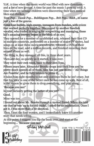 Y2K. A time when the music world was filled with new directions and a lot of new groups. A time far past the music I grew up with. A time when my teenage children were discovering their own musical likes and dislikes. Teen Pop... Dance Pop... Bubblegum Pop... Brit Pop... Euro Pop... to name just a few of the genres. Enter four bubbly, high-energy, teenagers from Sweden, with voices that worked perfectly together. Discovered by another Swedish vocalist, who traded in singing for songwriting and managing, these kid's amazing journey began in the blink of an eye. They opened for a number of established acts, released their first CD in multiple countries, performed on a number of major TV shows, had songs on at least three movie soundtracks, released a DVD of their lives on the road, sold a million records, and finished recording their second album as well. The thing is, they managed all this, in three short years. Then one day, as quickly as it started, it was over. They went their own ways... back to their own lives. Fifteen years later, Alexander Brooks drops into their lives - and pretty much upends all of them. Alex has just one motto - 'All Things Are Possible', and he fully intends to prove it. It takes him eight months to not only convince them that he isn't crazy, but that his 'idea' is one of the better ones he has come up with. Best of all, is the reason he gives them to drop everything, and play along. 'Because you can!' Is your curiosity getting the better of you yet? Good. Mine was too. I found out about all this through a friend that Mr. Brooks and I share. When she told me that he was 'up to his old tricks', I asked for an explanation. Once I got it, I was more than a bit skeptical. Then, I met the four women, and I immediately knew it's another story that needs telling. At this point, I suggest you start at the beginning... simply 'because you can'