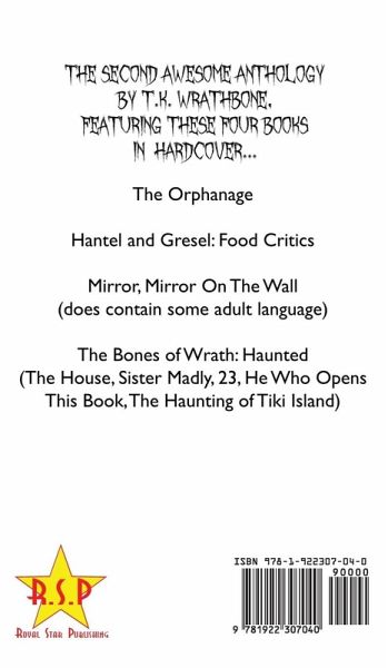 ****This is the 5x8 case laminate hardcover version (no dust jacket) The second awesome anthology by T.K. Wrathbone, featuring these four e-books in hardcover... The Orphanage Hantel and Gresel: Food Critics Mirror, Mirror On The Wall (does contain some adult language) The Bones of Wrath: Haunted (The House, Sister Madly, 23, He Who Opens This Book, The Haunting of Tiki Island)