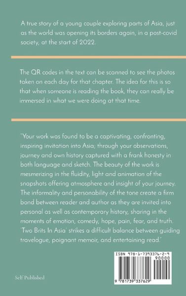 A true story of a young couple exploring parts of Asia, just as the world was opening its borders again, in a post-covid society, at the start of 2022. The QR codes in the text can be scanned to see the photos taken on each day for that chapter. The idea for this is so that when someone is reading the book, they can really be immersed in what we were doing at that time.