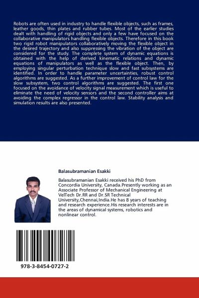 Robots are often used in industry to handle flexible objects, such as frames, leather goods, thin plates and rubber tubes. Most of the earlier studies dealt with handling of rigid objects and only a few have focused on the collaborative manipulators handling flexible objects. Therefore in this book two rigid robot manipulators collaboratively moving the flexible object in the desired trajectory and also suppressing the vibration of the object are considered for the study. The complete system of dynamic equations is obtained with the help of derived kinematic relations and dynamic equations of manipulators as well as the flexible object. Then, by employing singular perturbation technique slow and fast subsystems are identified. In order to handle parameter uncertainties, robust control algorithms are suggested. As a further improvement of control law for the slow subsystem, two control algorithms are suggested. The first one focused on the avoidance of velocity signal measurement which is useful to eliminate the need of velocity sensors and the second controller aims at avoiding the complex regressor in the control law. Stability analysis and simulation results are also presented.