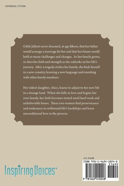 Odile Jalbert never dreamed, at age fifteen, that her father would arrange a marriage for her and that her future would hold so many challenges and changes. As her family grows, so does her faith and strength as she embarks on her life?s journey. After a tragedy strikes her family, she finds herself in a new country, learning a new language and reuniting with other family members. Her eldest daughter, Alice, learns to adjust to her new life in a strange land. When she falls in love and begins her own family, her faith becomes tested amid hard work and unbelievable losses. These two women find perseverance and endurance to withstand life?s hardships and learn unconditional love in the process.
