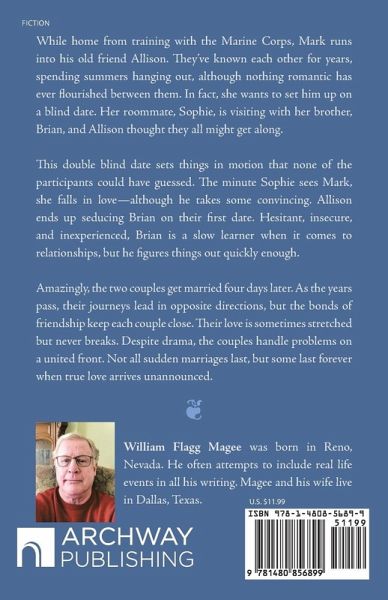 While home from training with the Marine Corps, Mark runs into his old friend Allison. Theyve known each other for years, spending summers hanging out, although nothing romantic has ever flourished between them. In fact, she wants to set him up on a blind date. Her roommate, Sophie, is visiting with her brother, Brian, and Allison thought they all might get along. This double blind date sets things in motion that none of the participants could have guessed. The minute Sophie sees Mark, she falls in lovealthough he takes some convincing. Allison ends up seducing Brian on their first date. Hesitant, insecure, and inexperienced, Brian is a slow learner when it comes to relationships, but he figures things out quickly enough. Amazingly, the two couples get married four days later. As the years pass, their journeys lead in opposite directions, but the bonds of friendship keep each couple close. Their love is sometimes stretched but never breaks. Despite drama, the couples handle problems on a united front. Not all sudden marriages last, but some last forever when true love arrives unannounced.
