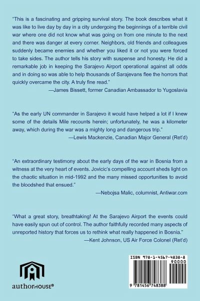 "This is a fascinating and gripping survival story. The book describes what it was like to live day by day in a city undergoing the beginnings of a terrible civil war where one did not know what was going on from one minute to the next and there was danger at every corner. Neighbors, old friends and colleagues suddenly became enemies and whether you liked it or not you were forced to take sides. The author tells his story with suspense and honesty. He did a remarkable job in keeping the Sarajevo Airport operational against all odds and in doing so was able to help thousands of Sarajevans flee the horrors that quickly overcame the city. A truly fine read." -James Bissett, former Canadian Ambassador to Yugoslavia "As the early UN commander in Sarajevo it would have helped a lot if I knew some of the details Mile recounts herein; unfortunately, he was a kilometer away, which during the war was a mighty long and dangerous trip." -Lewis Mackenzie, Canadian Major General (Ret'd) "An extraordinary testimony about the early days of the war in Bosnia from a witness at the very heart of events. Jovicic's compelling account sheds light on the chaotic situation in mid-1992 and the many missed opportunities to avoid the bloodshed that ensued." -Nebojsa Malic, columnist, Antiwar.com "What a great story, breathtaking! At the Sarajevo Airport the events could have easily spun out of control. The author faithfully recorded many aspects of unreported history that forces us to rethink what really happened in Bosnia." -Kent Johnson, US Air Force Colonel (Ret'd)