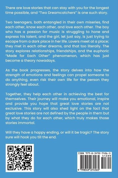 There are love stories that can stay with you for the longest time possible, and "Two Dreamcatchers" is one such story. Two teenagers, both entangled in their own miseries, find each other, know each other, and love each other. The boy who has a passion for music is struggling to hone and express his talent, and the girl, let just say, is just trying to escape from a dark place in her life. Lovers meet at a place; they met in each other dreams, and that too literally. The story explores relationships, friendships, and the euphoric "Made for Each Other" phenomenon, which has just become a theory nowadays. As the book progresses, the story delves into how the strength of emotions and feelings can propel someone to do anything, even risk their own life for the person they strongly feel about. Together, they help each other in achieving the best for themselves. Their journey will make you emotional, inspire and provide you hope that great love stories are not exclusive. This story will also shed light on the fact that great love stories are not defined by the people in them but by what they do for each other, which truly makes those stories immortal. Will they have a happy ending, or will it be tragic? The story sure will hook you till the end.