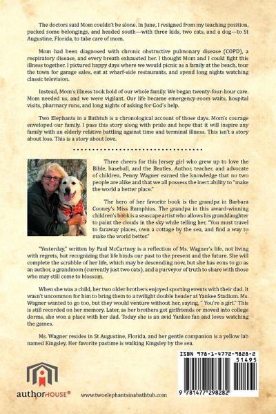 The doctors said Mom couldn't be alone. In June, I resigned from my teaching position, packed some belongings, and headed south-with three kids, two cats, and a dog-to St Augustine, Florida, to take care of mom. Mom had been diagnosed with chronic obstructive pulmonary disease (COPD), a respiratory disease, and every breath exhausted her. I thought Mom and I could fight this illness together. I pictured happy days where we would picnic as a family at the beach, tour the town for garage sales, eat at wharf-side restaurants, and spend long nights watching classic television. Instead, Mom's illness took hold of our whole family. We began twenty-four-hour care. Mom needed us, and we were vigilant. Our life became emergency-room waits, hospital visits, pharmacy runs, and long nights of asking for God's help. Two Elephants in a Bathtub is a chronological account of those days. Mom's courage enveloped our family. I pass this story along with pride and hope that it will inspire any family with an elderly relative battling against time and terminal illness. This isn't a story about loss. This is a story about love.