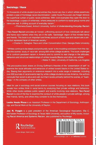 Two-Faced Racism examines and explains the racial attitudes and behaviours exhibited by whites in private settings. While there are many books that deal with public attitudes, behaviours, and incidences concerning race and racism (frontstage), there are few studies on the attitudes whites display among friends, family, and other whites in private settings (backstage). The core of this book draws upon 626 journals of racial events kept by white college students at twenty-eight colleges in the United States. The book seeks to comprehend how whites think in racial terms by analyzing their reported racial events.