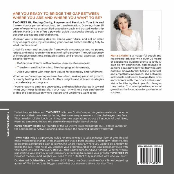 Are you ready to bridge the gap between where you are and where you want to be? TWO FEET IN: Finding Clarity, Purpose, and Passion in Your Life and Career is your personal roadmap to transformation. Drawing from 25 years of experience as a certified executive coach and trusted leadership advisor, Maria Cristini offers a powerful guide that speaks directly to your deepest aspirations and challenges. Uncover your simmering desires, shape your future, and act on what truly energizes you, by actualizing your dreams and committing fully to what matters most. Cristini's clear and actionable framework encourages you to pause, reflect, and make room for the magic of self-discovery. Through a journey of interactive questions, relatable stories, and practical exercises, you'll discover how to: Define your dreams with a flexible, step-by-step process; Transform small actions into life-changing achievements; Align your days with your core values for lasting joy and fulfillment. Whether you're navigating a career transition, seeking personal growth, or simply feeling stuck, this book offers insights and efficient strategies to accelerate your progress. If you're ready to embrace uncertainty and establish a clear path toward living your most fulfilling life, TWO FEET IN will help you confidently bridge the gap between where you are and where you want to be.