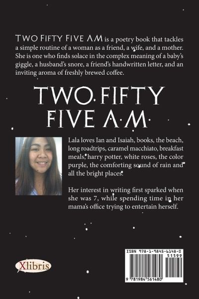 Two Fifty Five AM is a poetry book that tackles a simple routine of a woman as a friend, a wife, and a mother. She is one who finds solace in the complex meaning of a baby's giggle, a husband's snore, a friend's handwritten letter, and an inviting aroma of freshly brewed coffee.