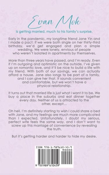 Evan Mok is getting married, much to his family's surprise. Early in the pandemic, my longtime friend Jane Yin and I made a pact: if we were both single on her thirty-third birthday, we'd get engaged and plan a simple wedding. We were lonely, envious of people who weren't isolated in apartments by themselves. More than three years have passed, and I'm ready. Even if I'm outgoing and optimistic on the outside, I've given up on romantic love, and it'll be nice to build a life with my friend. With both of our savings, we can actually afford a house. Jane also longs to be part of a family, and I can give her that. It sounds convenient and comfortable, but we won't have a physical relationship. It turns out that married life is just what I want it to be. We buy a place in the suburbs and eat dinner together every day. Neither of us is attracted to the other, except... Oh hell. I'm definitely starting to wish I could share a bed with Jane, and my feelings are much more complicated than I expected. Unfortunately, I doubt my serious, perfect wife feels the same way, and I don't want to screw up this marriage of convenience by revealing the truth. But it's getting harder and harder to hide my desire.