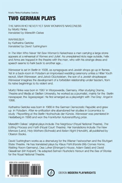 Katharina Gericke was born in 1966 in the German Democratic Republic and grew up in Potsdam. After the re-unification of Germany she abandoned her studies in Economics to study Playwriting at the 'Berlin Hochschule der Kunste'. She has written a number of plays, one of which - Warweser, translated by David Tushingham - was published by Oberon in association with the Goethe-Institut London. Moritz Rinke was born in 1967 in Wopswerde, Germany. After studying Drama, Theatre and Media at Giessen University he worked as a journalist, writing in particular for the Berlin newspaper, the Tagesspiegel. He first emerged as a playwright with 'The Grey Angel' in 1996. 'The Man Who Never Yet Saw Woman's Nakedness', translated by Meredith Oakes, was published by Oberon in association with the Goethe-Institut London. Meredith Oakes' first play, The Neighbour, was produced at the Royal National Theatre, London in 1992, and is published by Oberon Books. The Editing Process was first produced by the English Stage Company at the Royal Court Theatre, London, in 1994. Her translation include The New Menoza by Lenz, Horvath's Italian Night, and Bernhard's Elizabeth II. Opera Libretti include The Triumph of Beauty and Deceit and Solid Assets.