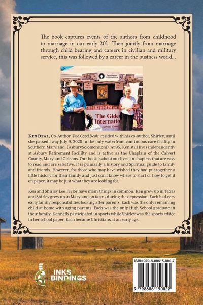 Ken Deal, Co-Author, Two Good Deals, resided with his co-author, Shirley, until she passed away July 9, 2020 in the only waterfront continuous care facility in Southern Maryland. (AsburySolomons.org). At 95, Ken still lives independently at Asbury Retirement Facililty and is active as the Chaplain of the Calvert County, Maryland Gideons. Our book is about our lives, in chapters that are easy to read and are selective. It is primarily a history and Spiritual guide to family and friends. However, for those who may have wished they had put together a little history for their family and just don't know where to start or how to get it on paper, it may be just what they are looking for.Ken and Shirley Lee Taylor have many things in common. Ken grew up in Texas and Shirley grew up in Maryland on farms during the depression. Each had very early family responsibilities looking after parents. Each was the only remaining child at home with aging parents. Each was the only High School graduate in their family. Kenneth participated in sports while Shirley was the sports editor in her school paper. Each became Christians at an early age.