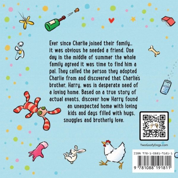 Everyone has been touched by a unique pup at some point in their lives. Ever since Charlie joined their family...it was obvious he needed a friend. One day in the middle of summer the whole family agreed it was time to find him a pal. They called the person they adopted Charlie from and discovered that Charlie's brother, Harry, was in desperate need of a loving home. Based on a true story of actual events, discover how Harry found an unexpected home with loving kids and days filled with hugs, snuggles and brotherly love. "Sooo sweet and well done! I really enjoyed reading it, especially knowing your family and the impact Harry and Charlie have had on you and vice versa. The illustrations are so cute and really convey the joy of the story." Deb B. Retired lifelong teacher and Principal