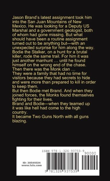 Jason Brand's latest assignment took him into the San Juan Mountains of New Mexico. He was looking for a Deputy US Marshal and a government geologist, both of whom had gone missing. But what should have been a routine assignment turned out to be anything but-with an unexpected surprise for him along the way. Bodie the Stalker, on a hunt for a brutal killer, rode the same trail. For him it was just another manhunt ... until he found himself on the wrong end of the chase. Then there was the Monk clan ... They were a family that had no time for visitors because they had secrets to hide and were more than prepared to kill in order to keep them. But then Bodie met Brand. And when they joined forces, the Monks found themselves fighting for their lives. Brand and Bodie-when they teamed up it was like hell had come to the high country. It became Two Guns North with all guns blazing.