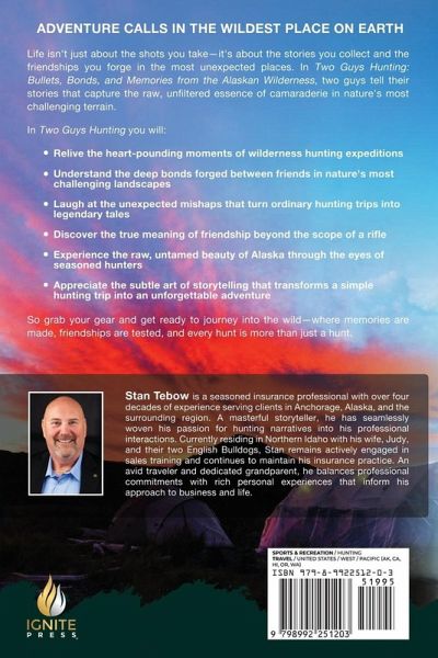 ADVENTURE CALLS IN THE WILDEST PLACE ON EARTH Life isn't just about the shots you take-it's about the stories you collect and the friendships you forge in the most unexpected places. In Two Guys Hunting: Bullets, Bonds, and Memories from the Alaskan Wilderness, two guys tell their stories that capture the raw, unfiltered essence of camaraderie in nature's most challenging terrain. In Two Guys Hunting you will: Relive the heart-pounding moments of wilderness hunting expeditions Understand the deep bonds forged between friends in nature's most challenging landscapes Laugh at the unexpected mishaps that turn ordinary hunting trips into legendary tales Discover the true meaning of friendship beyond the scope of a rifle Experience the raw, untamed beauty of Alaska through the eyes of seasoned hunters Appreciate the subtle art of storytelling that transforms a simple hunting trip into an unforgettable adventure So grab your gear and get ready to journey into the wild-where memories are made, friendships are tested, and every hunt is more than just a hunt.
