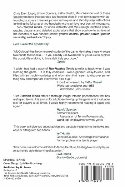 Chris Evert, Jimmy Connors, Kathy Rindaldi, Mats Wilander--all of these top players have incorporated two-handed shots in their tennis game with astounding success. Here are proven techniques and step-by-step instructions for hitting the full arrray of two-handed shots to achieve your best winning game. Two-Handed Tennis, by tennis instructor Jeff McCullough, contains photographs, diagrams and detailed explanations that show you how to achieve all the benefits of two-handed tennis: greater control, greater power, greater versatility, and reduced injury.